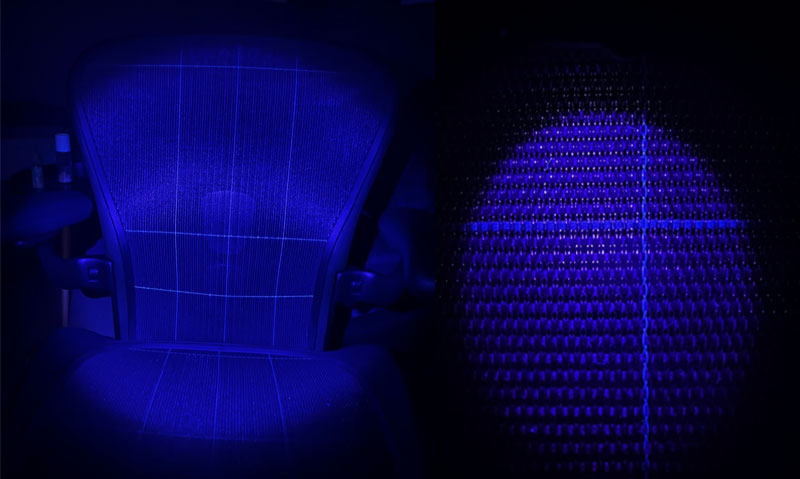 Для проверки пригодится ультрафиолетовый фонарик или лампа, понадобится выключить свет в помещении и просто посветить на спинку и сиденье кресла, у оригинального Aeron полоски сразу же проявятся.