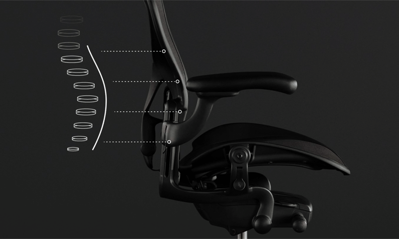 Одной из главных особенностей Aeron является его уникальная эргономическая конструкция. Кресло поддерживает позвоночник в области поясницы и спины, позволяя сидеть в естественном положении, спинка адаптируется под движения тела, благодаря гибкому каркасу и сетчатому материалу, что помогает минимизировать напряжение и предотвращает боли в спине. Адаптация кресла к естественным изгибам позвоночника делает его идеальным выбором для длительных часов гейминга Всему этому способствует наличие передовых технологий, делающих его идеальным для продолжительного нахождения в кресле и игры: